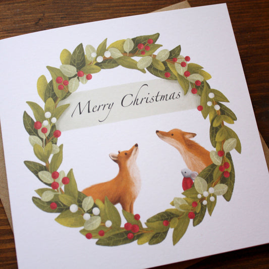 'Merry Christmas' Wreath Christmas Card with mouse & foxes - OLD CARD STOCK SALE