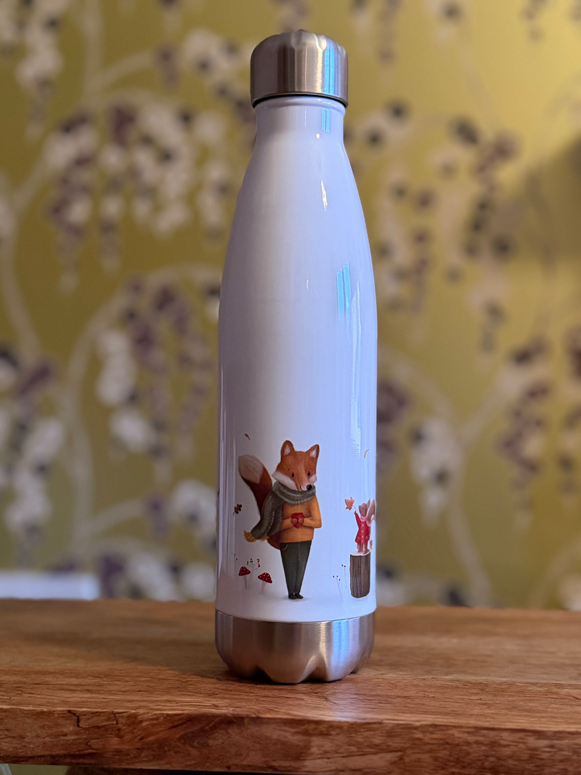 A 500ml inulated water bottle our Autumn Scene featuring a fox, hedge hog and squirrel illustration. The perfect way to keep your drinks hot or cold.
