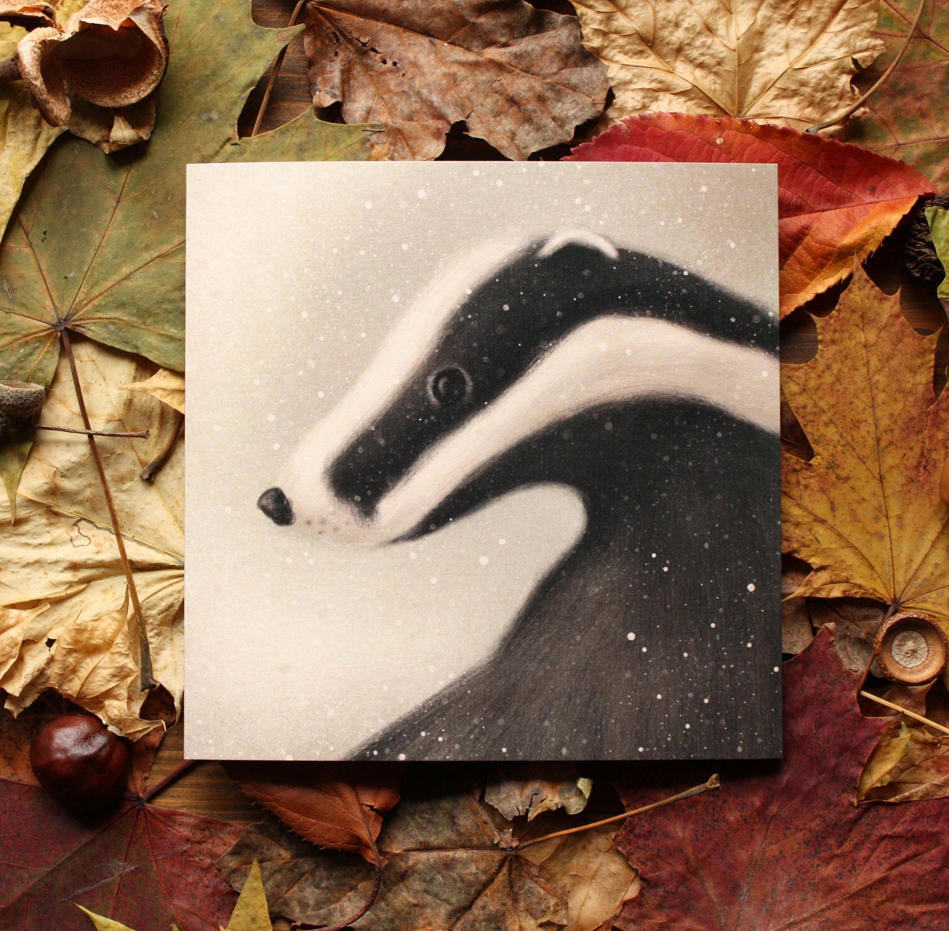 One of the cards from the 'Winter' Collection called 'Winter Badger' featuring an illustrated badger in the snow.