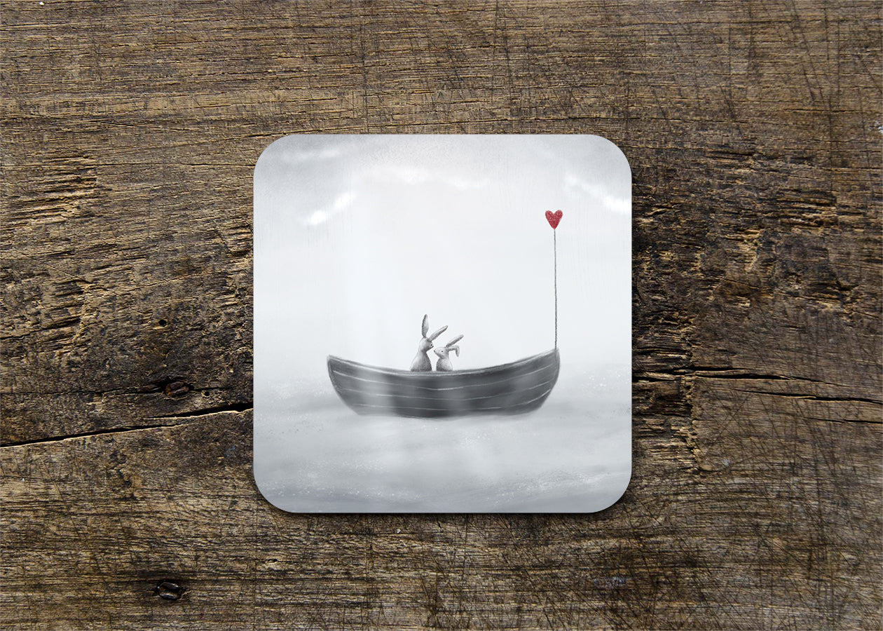 High gloss melamine square coaster featuring a scene of a boat floating on the sea with two rabbits gazing at each other. Perfect to send to someone special!