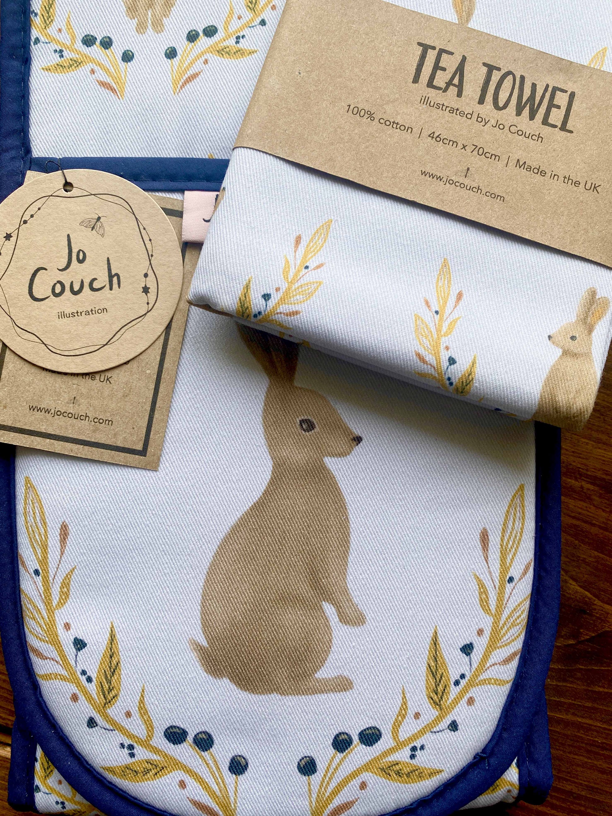 Rabbit & Floral Motif Double Oven Glove & Tea Towel Set