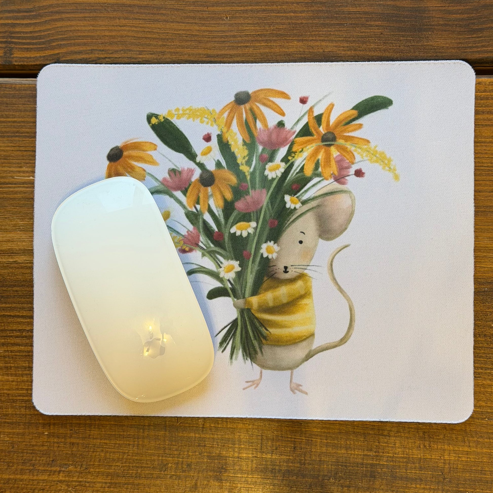 Mouse pad featuring my illustrated Mouse & Flowers would look perfect in the office or home. It has a smooth soft polyester fabric too and a non-slip rubber reverse and rounded corners.